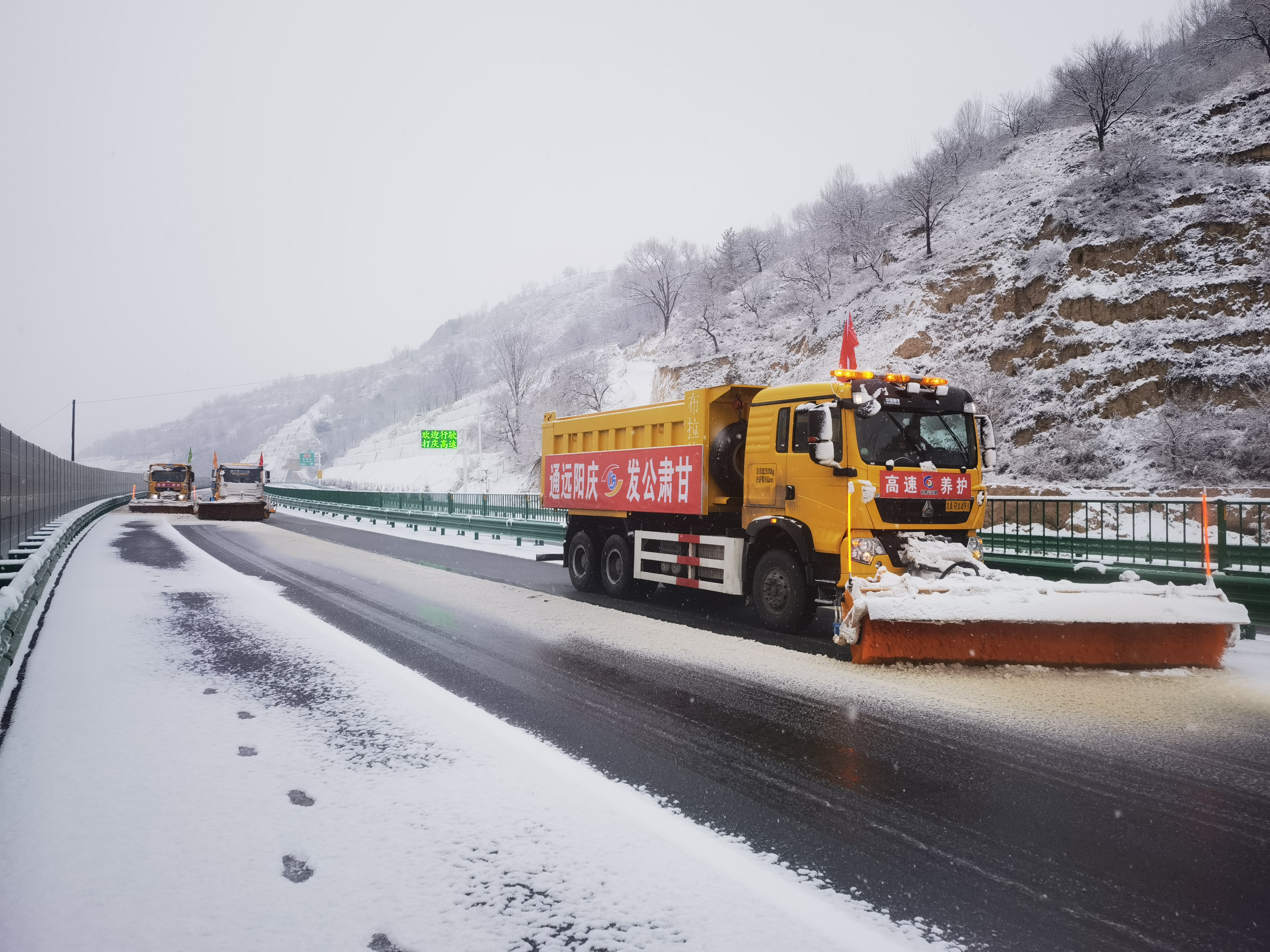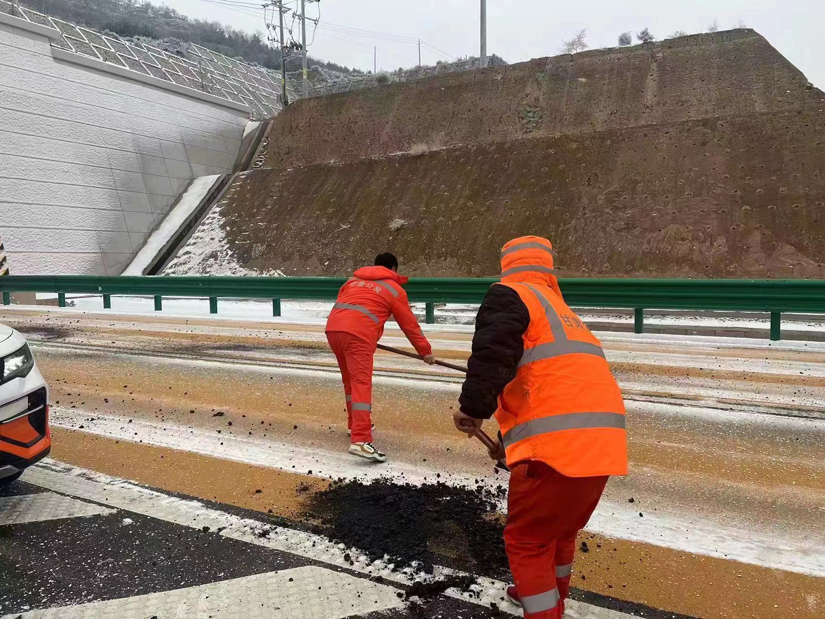 在项目公司道路巡检车带领下,养护单位对全路段循环往复进行大范围、小剂量的融雪剂撒布工作,并对桥面和弯道等重点部分进行大剂量、多频次的撒布作业,防止夜间低温发生结冰。