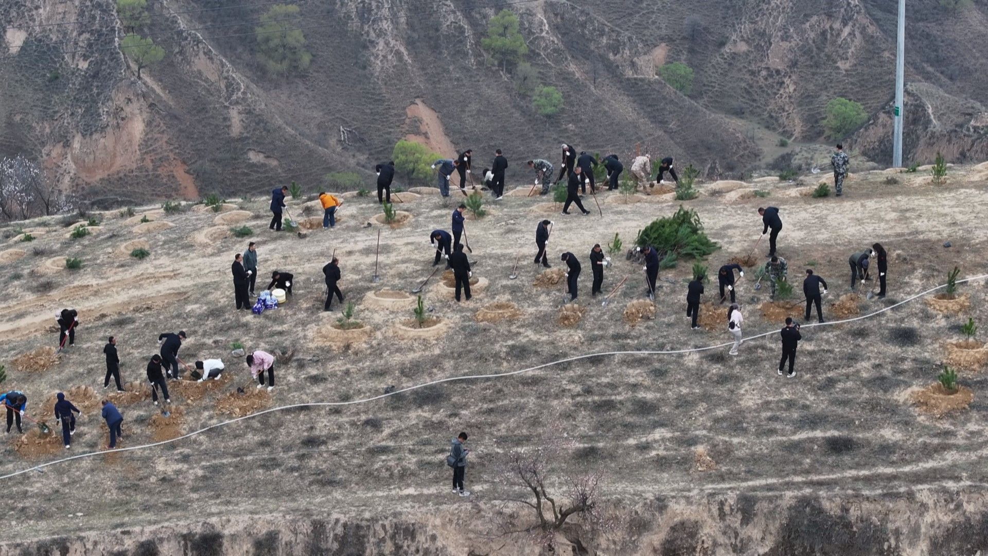 出镜记者张倩敏:“华池处处添新绿,大地层层翠意浓。大家好,我是华池县融媒体中心记者张倩敏。此刻我正身处于华池县柔远镇柳湾村的义务植树活动现场,和全县的干部职工一起参与义务植树活动。绿水青山就是金山银山,义务植树是我们共同的责任。大家挥锹铲土、扶苗浇水,一派热火朝天的景象。让我们用实际行动为家乡增绿添彩,一起建设生态美丽新华池。”
